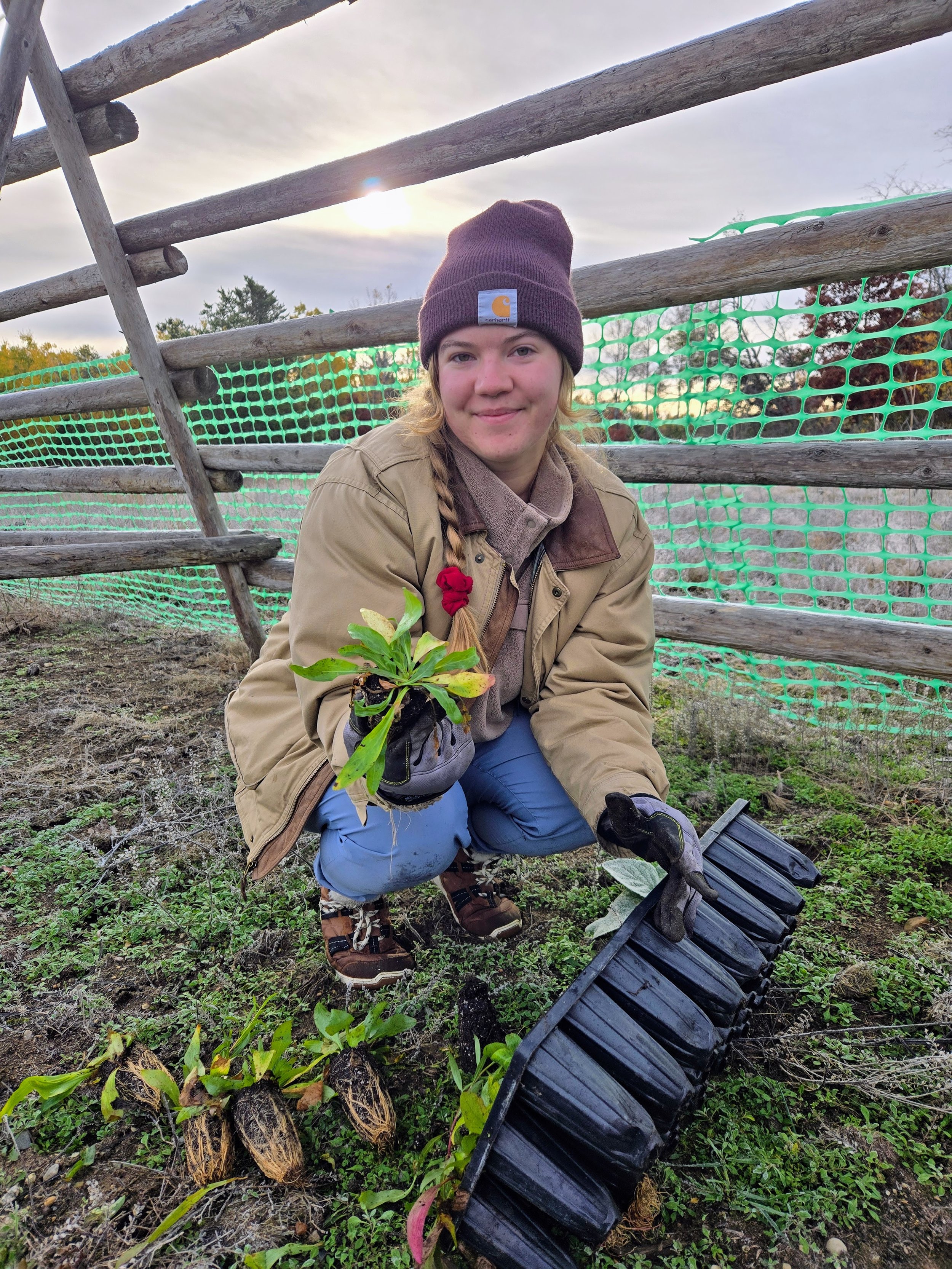 Volunteer Isabel Bauer plants native plugs in a fenced area of the Mio Prairie propagation site in October.
